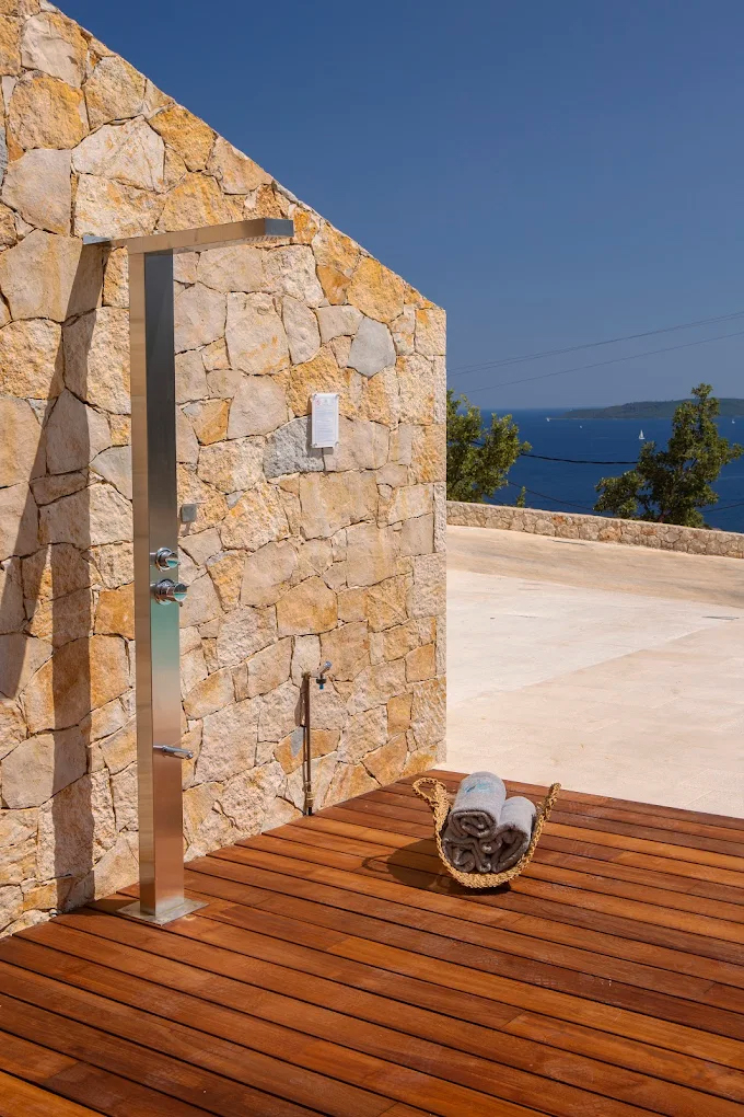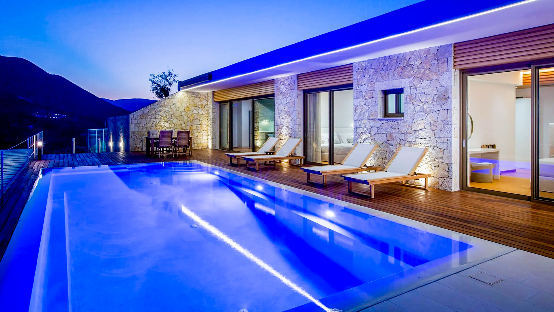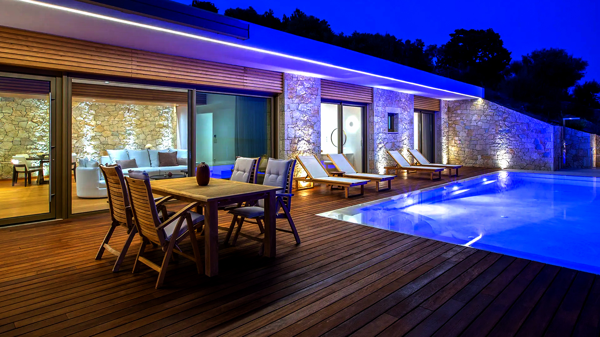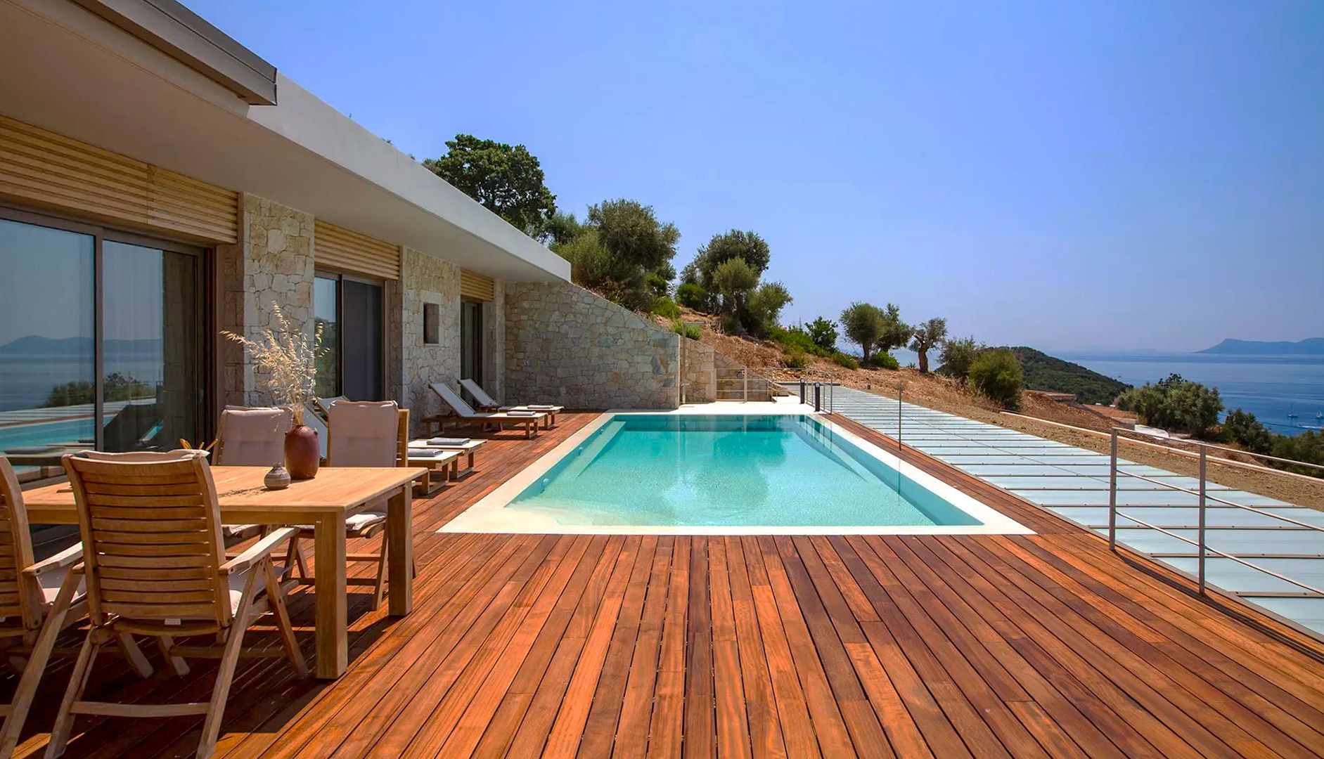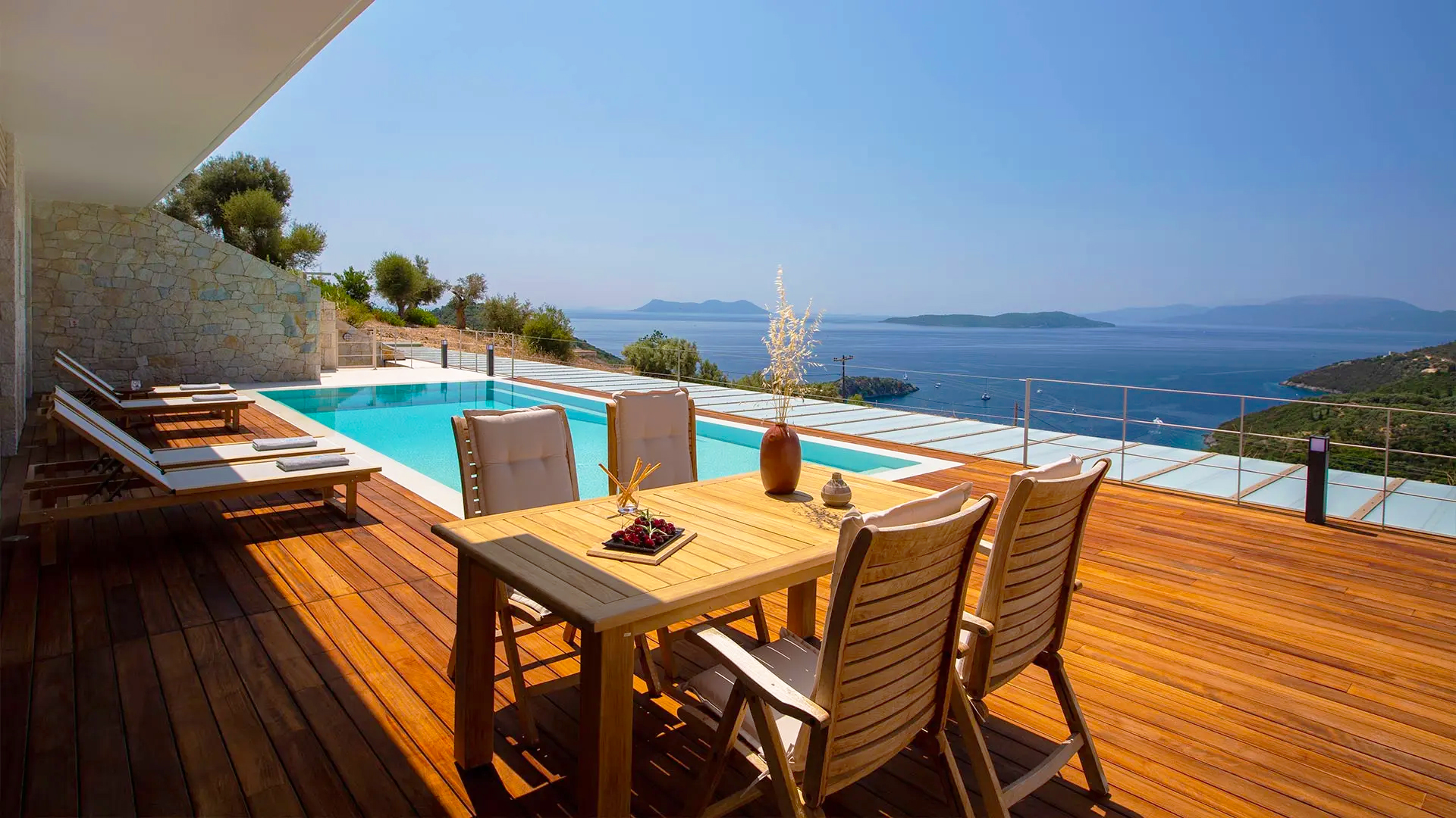 Al fresco slow-living lifestyle at Villa Sigma revolves around the remarkable 50sqm saltwater infinity pool, which is centre piece of the outdoor terrace area blending across the endless blue palette of the Ionian Sea. The outdoor space of Villa Sigma is designed with Iroko wood deck paired with natural white stone, creating a space that feels both stylish and timeless respecting the island slow living lifestyle at your own pace. Comfortable outdoor modern furnishings make it easy to relax throughout the day, whether you are having your morning coffee, enjoying the sun, or unwinding in the evening.