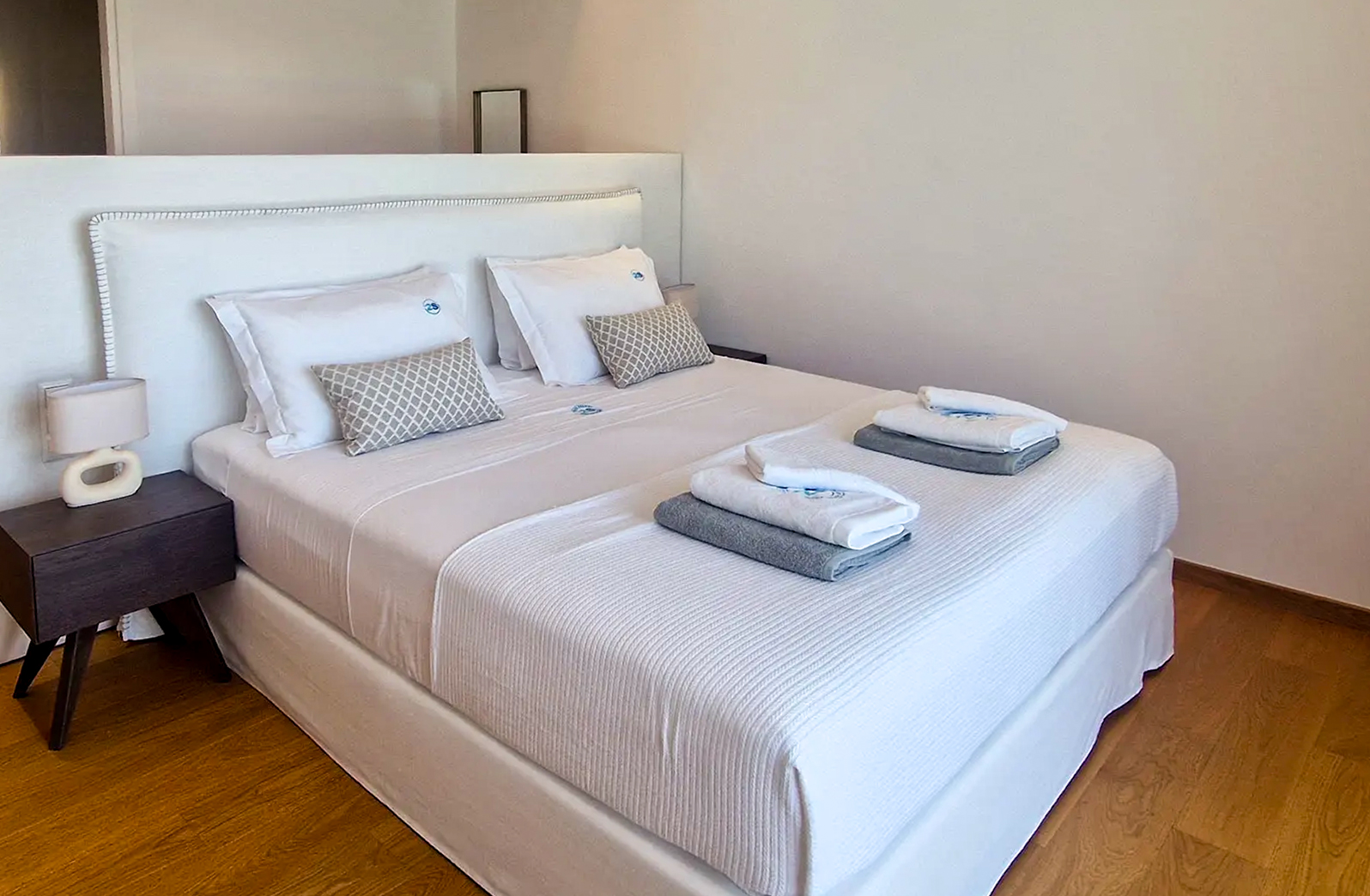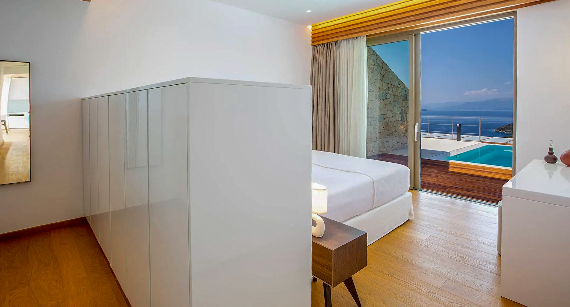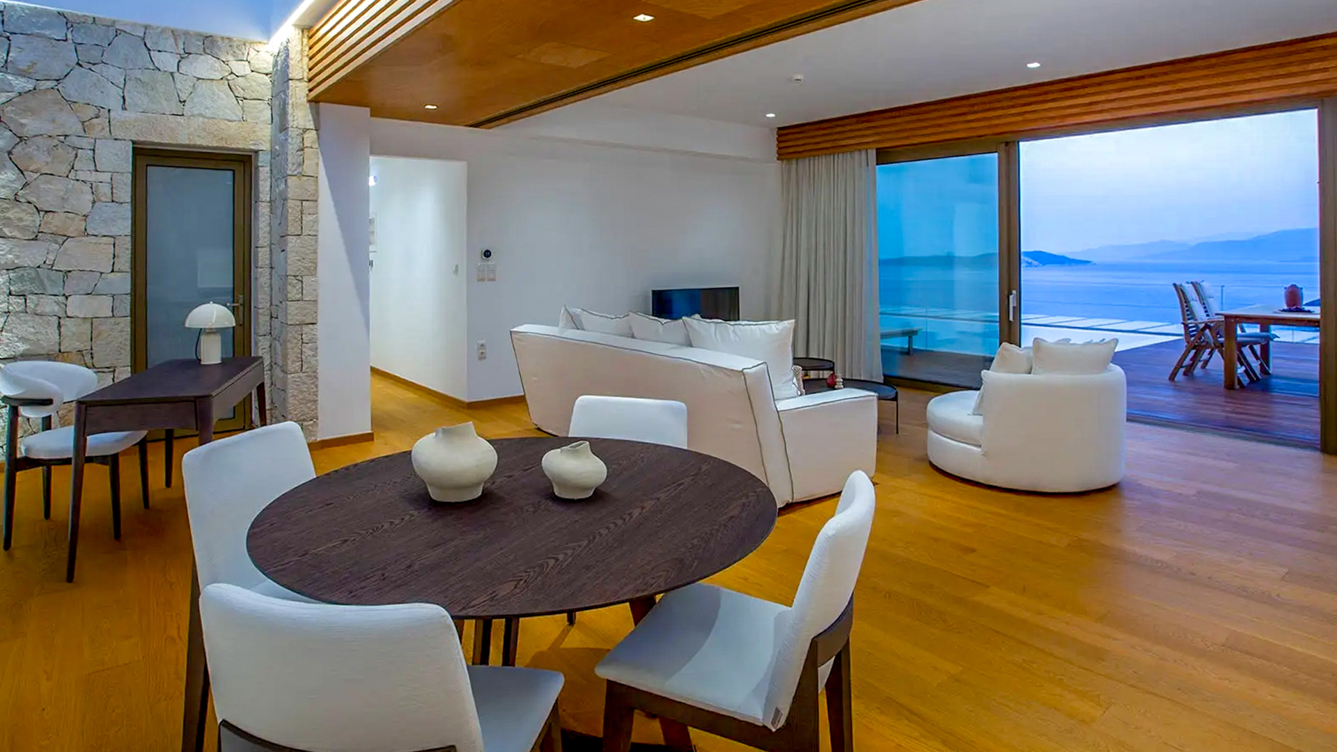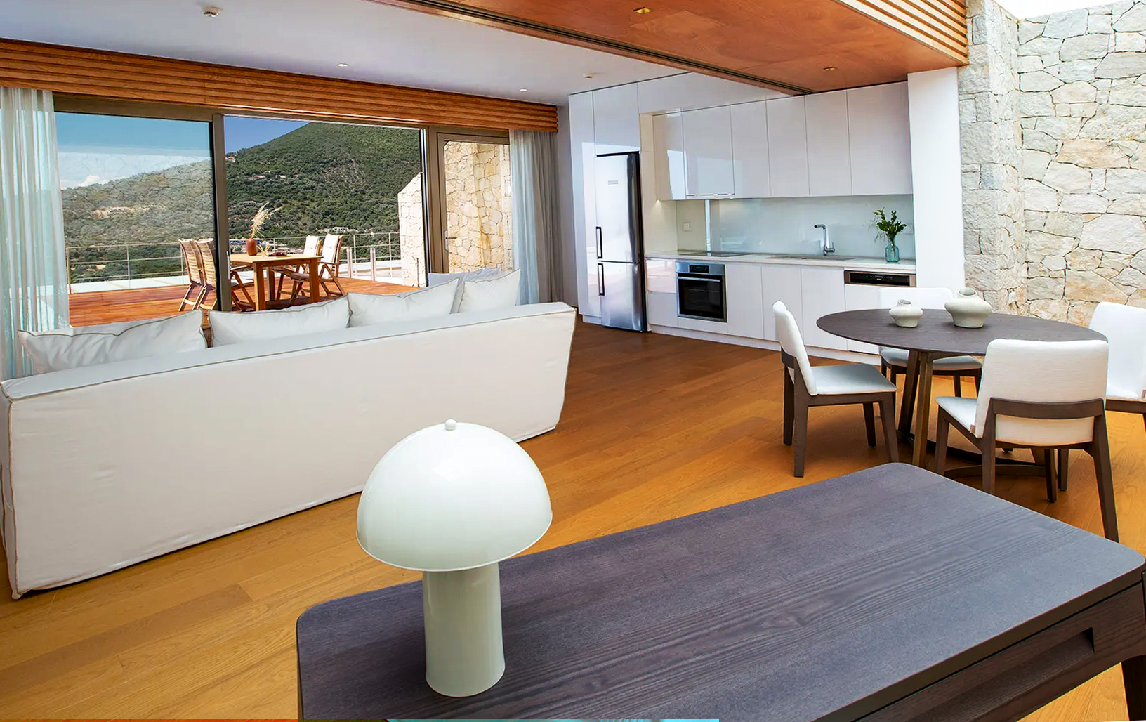 The design centres around the beauty of simplicity with an indoor-outdoor synergy filling the space through floor-to-ceiling sliding glass doors, filling the indoors with natural light and giving you crystal blue views from every corner as you would expect when choosing your Luxury Villa in Greece. The fully equipped kitchen and large living room provide plenty of space for shared meals and relaxation from sunrise to sunset.