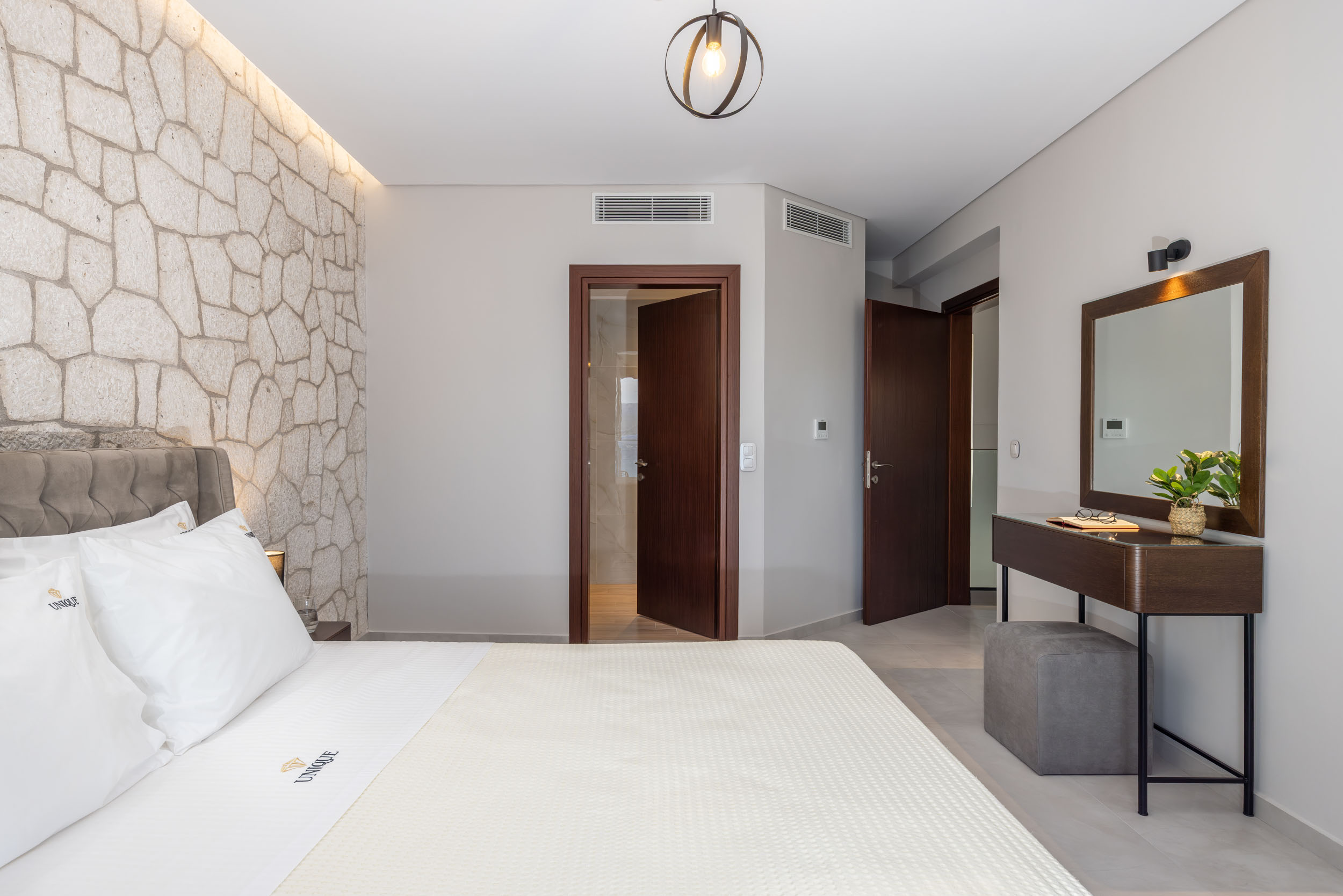 Upon entering Villa Unique, you come into the large living space which will take you away with its indoor-outdoor synergy created from the floor-to-ceiling window sliding doors. The space in front of you consists of a spacious kitchen with dining island and a spacious lounge area. The selective furniture oozing luxury and comfort adds to the one-of-a-kind character of Villa Unique. At the far end of the ground floor level is the first of the four bedrooms. The bedroom consists of a double bed and the convenience of an ensuite bathroom. All this space has direct access to the outdoor area of Villa Unique.