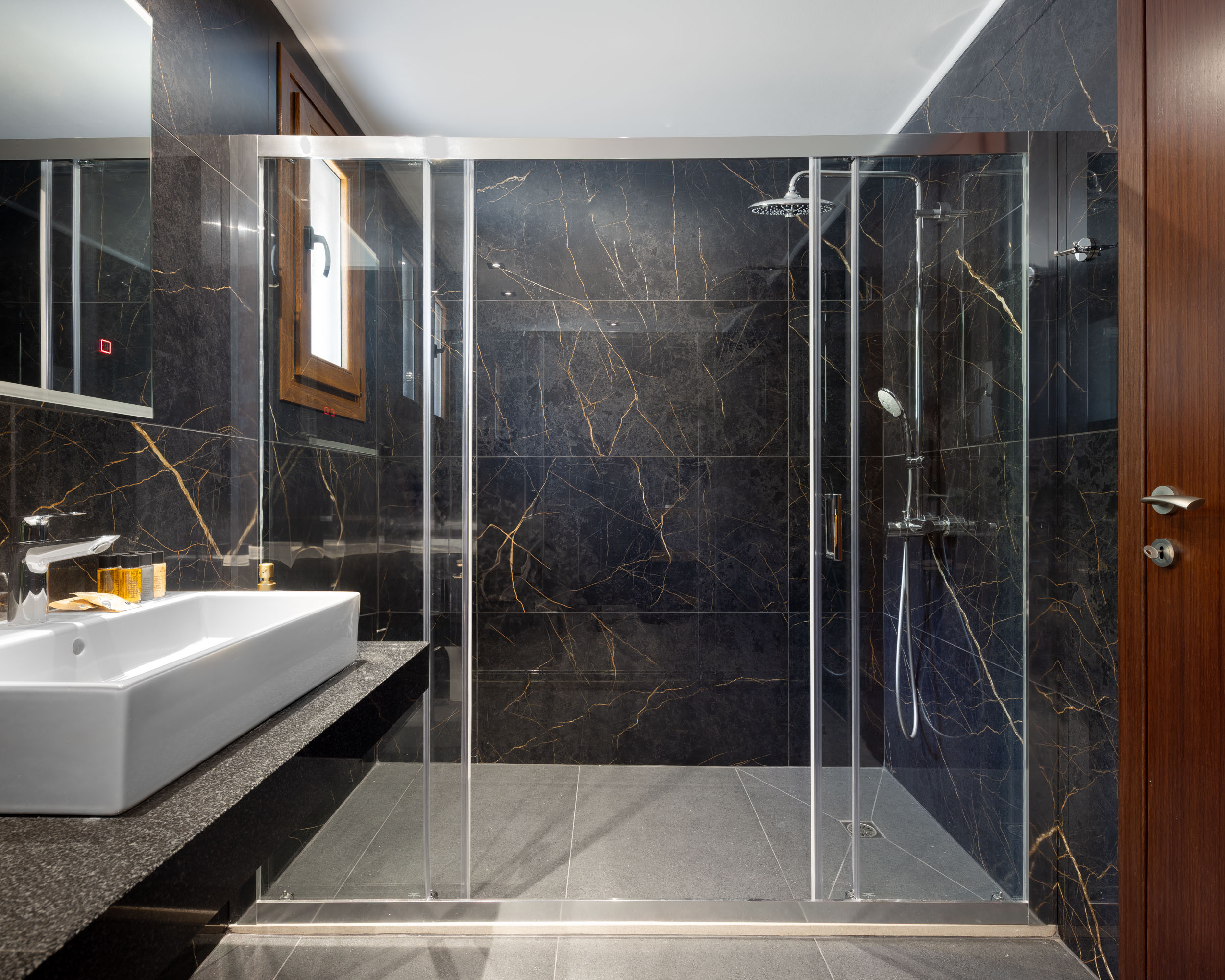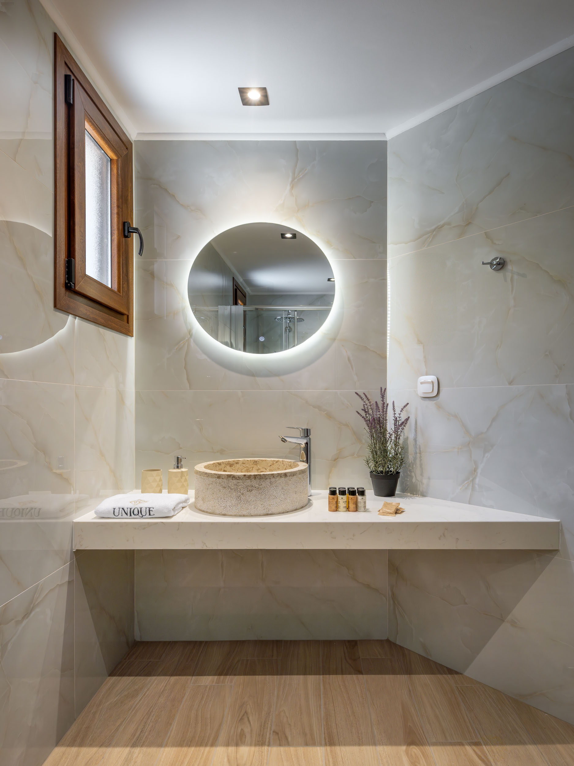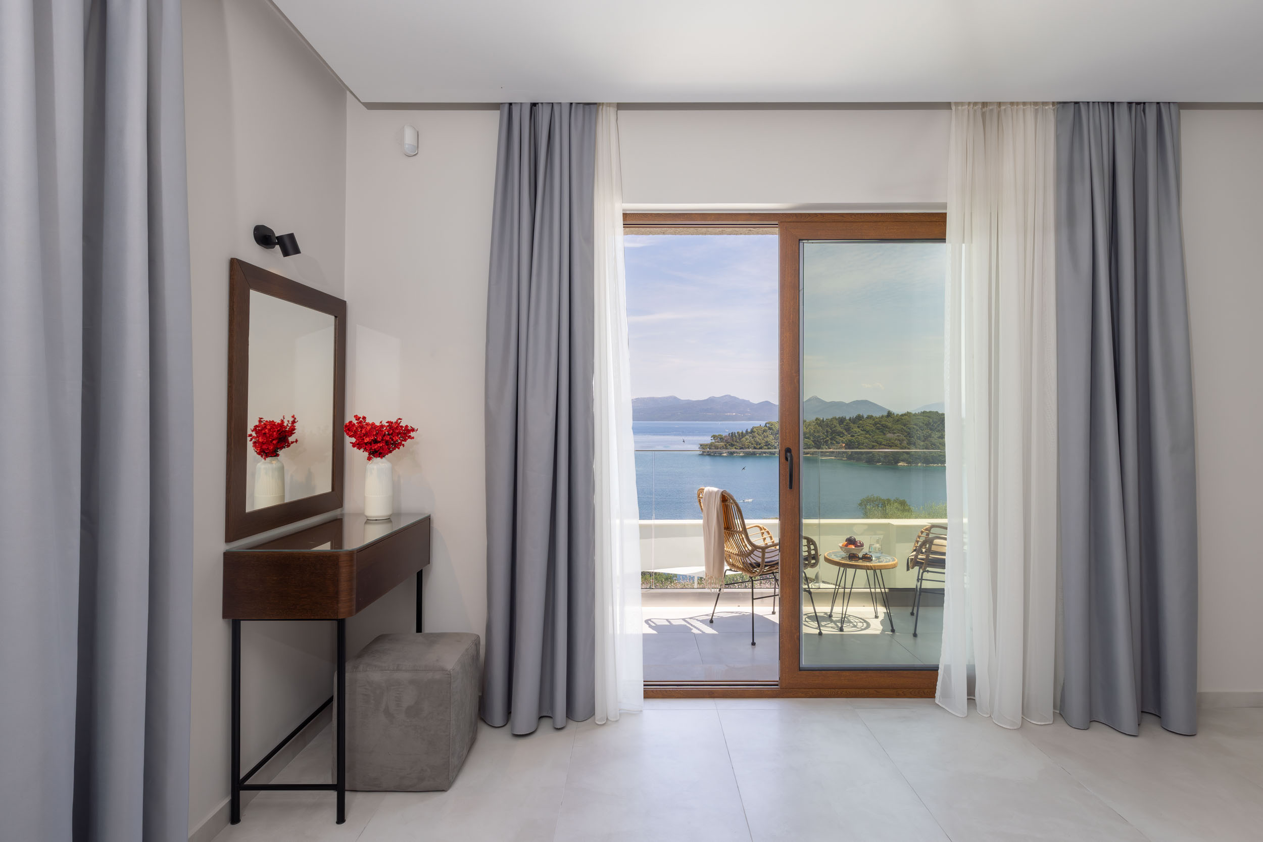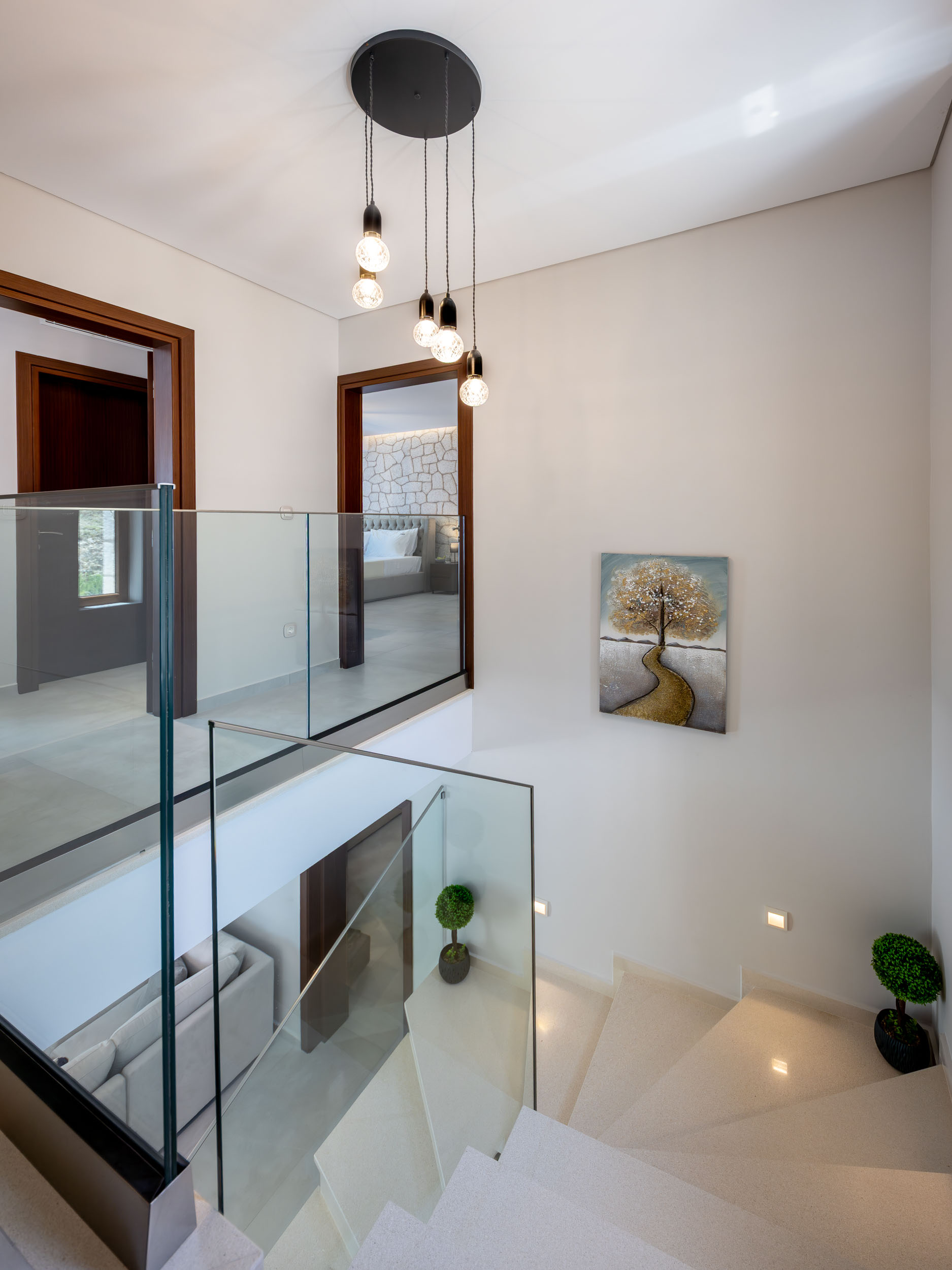 Via the internal staircase again from the ground level, you come to the upper level where you will find the other three bedrooms all convenient with ensuite bathrooms. Starting from the left of the hallway are two bedrooms, with the first furnished with a queen-sized bed and the second bedroom acting as the twin bedroom, preferably for children. The last of the three bedrooms to the right of the hallway acts as the master bedroom. Every morning all three bedrooms are filled with the beauty of the Greek sunrise coming through the window sliding doors across the crystal blue waters of the Ionian Archipelagos.